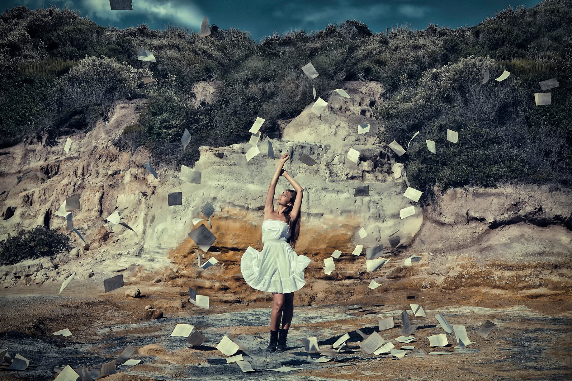 Una chica con un vestido blanco que se desarrolla en el viento, las hojas de los libros vuelan alrededorUna chica con un vestido blanco que se desarrolla en el viento, las hojas de los libros vuelan alrededor