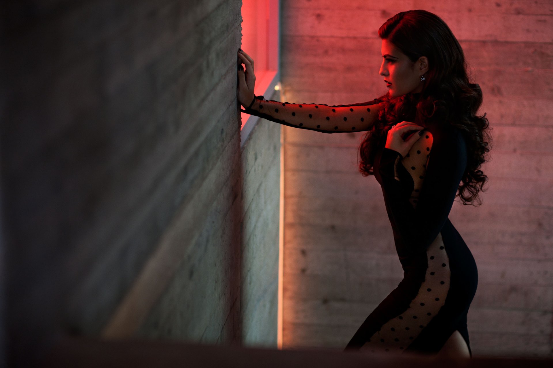 Estilo clásico: vestido negro con lunares blancos, bolso rojo y guantes, corte de pelo cuadradoEstilo clásico: vestido negro con lunares blancos, bolso rojo y guantes, corte de pelo cuadrado