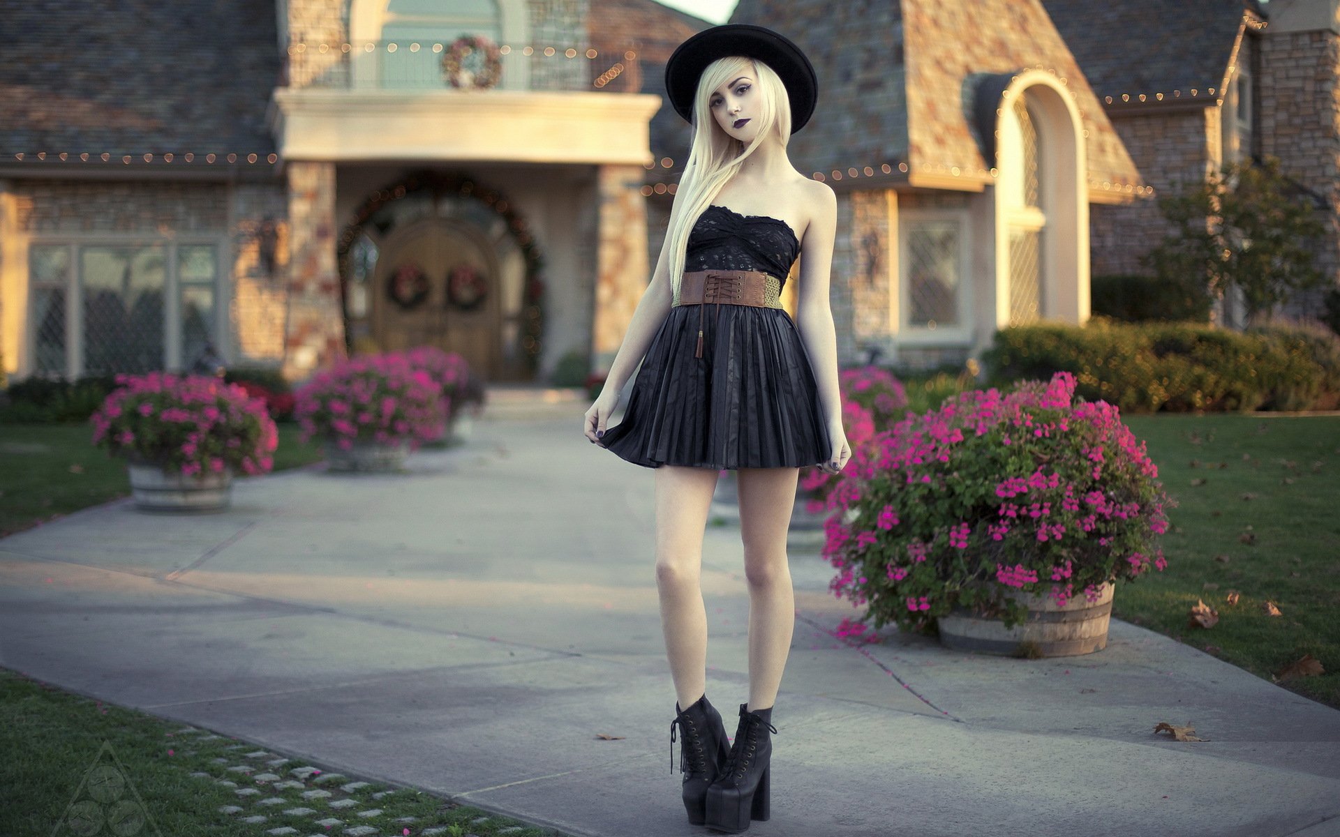 Chica con vestido negro posando en el fondo de la casaChica con vestido negro posando en el fondo de la casa
