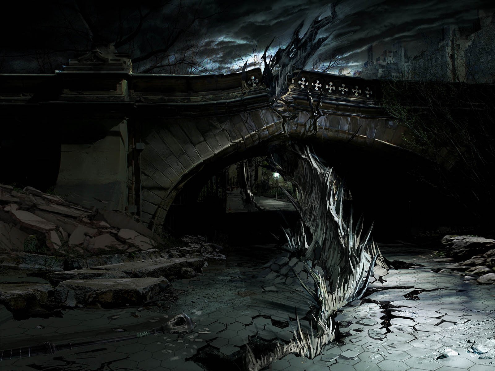Puente viejo en la oscuridad de la noche