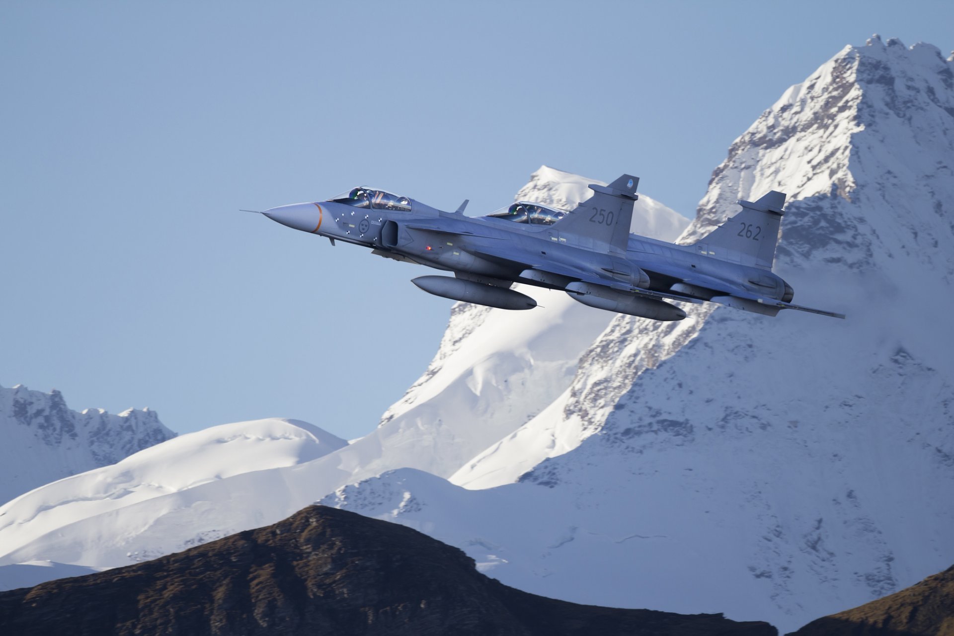Avión de combate en vuelo de afeitar sobre montañas nevadas